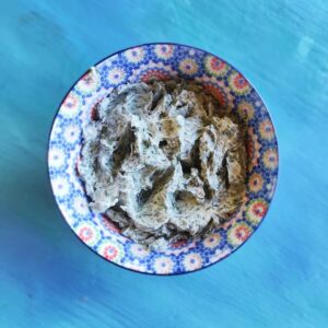 30/40 g di erbe spontanee tritate: artemisia, achillea, erba cipollina (o foglie di aglio orsino o aglio delle vigne se è il periodo), origano, menta, malva, salvia, rosmarino, timo serpillo, erba luigia, ortica, podagraria ecc;