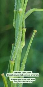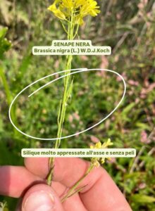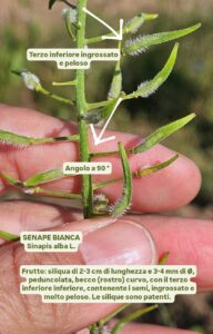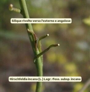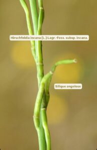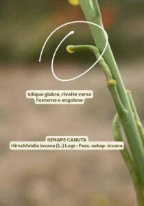 - Silique a sezione quadrangolare, glabre, erette, appressate all’asse; con 3-5 semi globosi, bruno-nerastri.