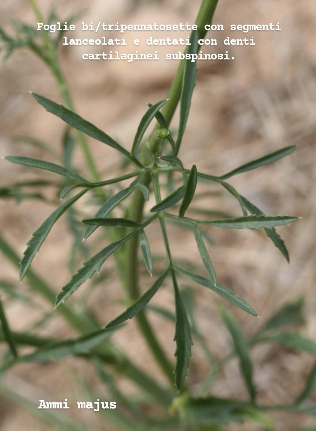 Ammi majus: alto 60 cm, fusto eretto, striato, scanalato e glabro. Foglie bi/tripennatosette con segmenti lanceolati e dentati con denti cartilaginei subspinosi. Ombrelle a 15-30 raggi. Involucro con brattee filiformi. Frutti glabri e costoluti.