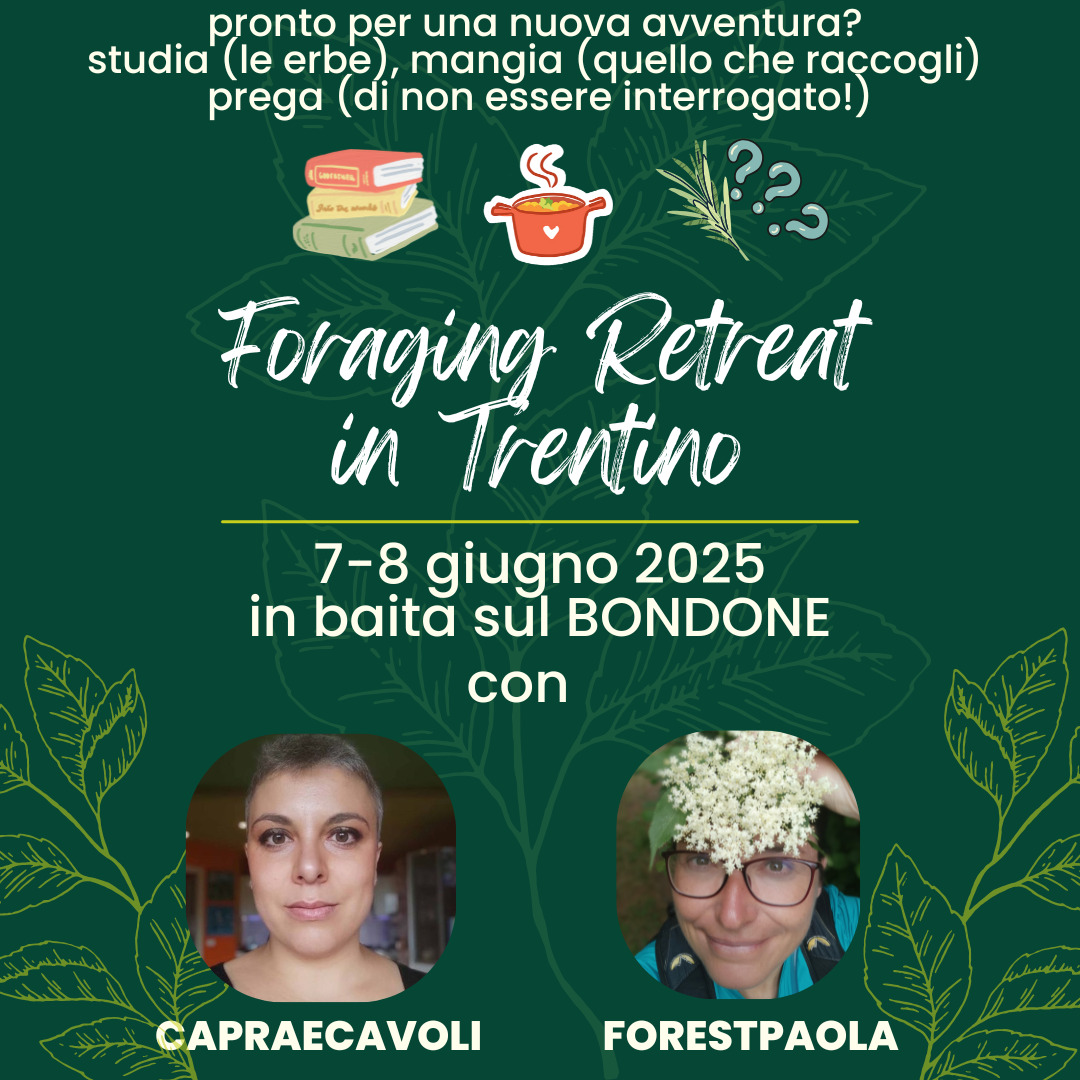 Ci siamo così divertite ed entusiasmate nel settembre 2024 che rinnoviamo la proposta per una vera immersione nelle erbe anche nel 2025: tranquilli non sarà necessario affrontare rovi accalappiastudenti, bevande a base di cicuta o sgabelli con pigne pungenti… venite al FORAGING RETREAT in BONDONE (Trento)